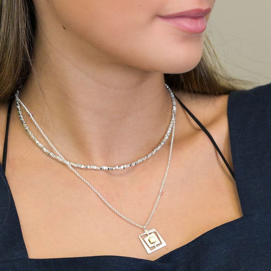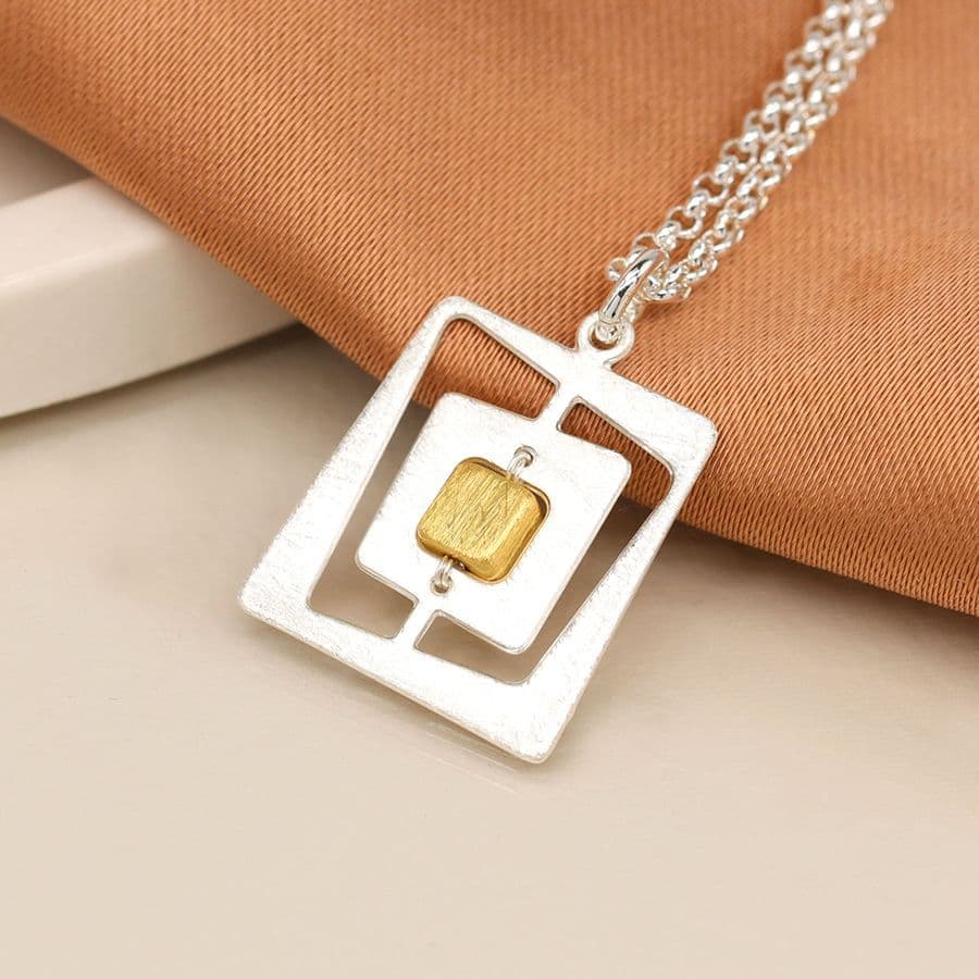 Faux gold plated irregular nested square necklace with central silver plated cube and scratched finish