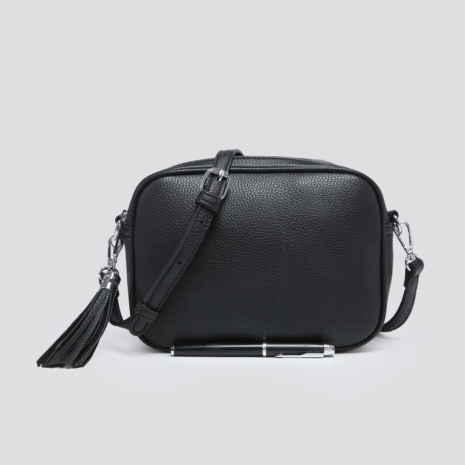 Simple crossbody bag with a double zip, tassel detail and silver hardware