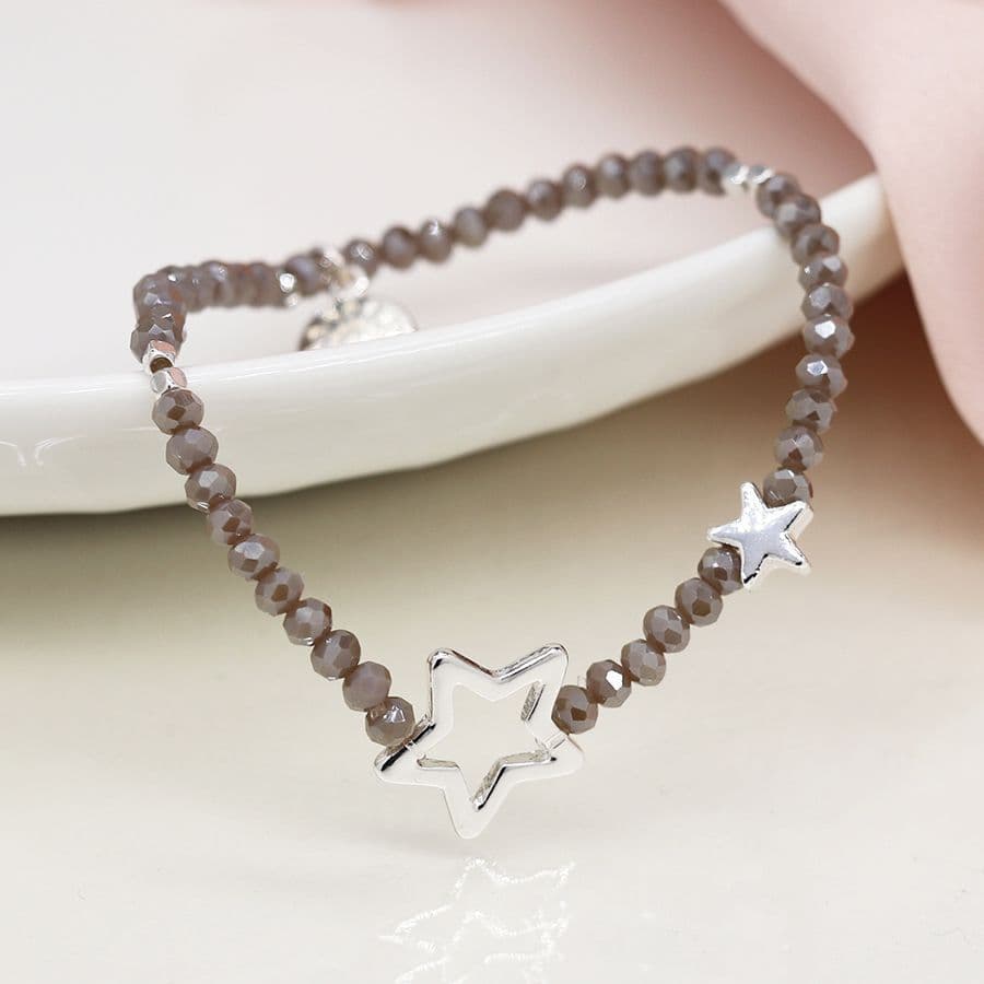 Grey faceted bead bracelet with one large silver plated cut-out star and a small silver plated solid star.