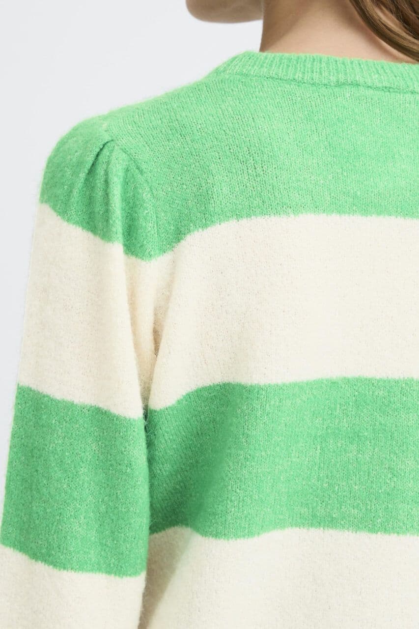 Striped sweater with wide horizontal bands, straight silhouette, crew neckline, and long sleeves. Soft texture and ribbed trims provide an easy, modern finish.