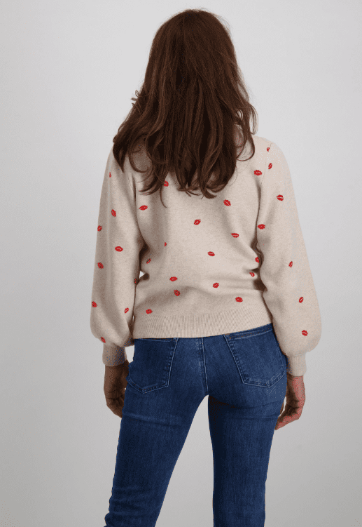Playful yet effortlessly chic, this knit jumper adds a fun twist to your everyday wardrobe. Crafted in a soft neutral tone and scattered with bold red lip prints, it’s designed with a classic crew neckline, long sleeves, and ribbed cuffs for a cozy finish. The relaxed fit makes it perfect for pairing with jeans for a casual look or dressing up with tailored trousers for a quirky statement.