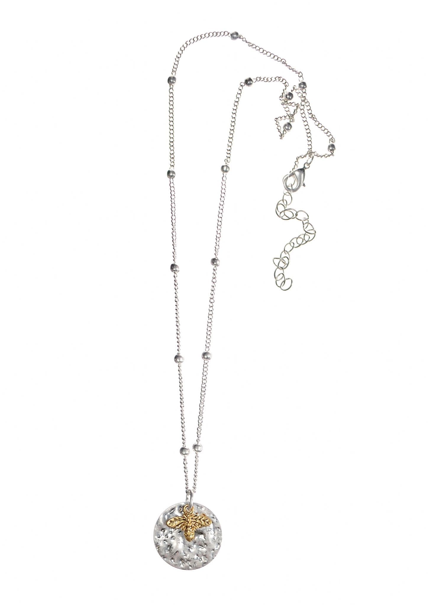 Silver chain necklace with silver disc and gold bee details. Mid length