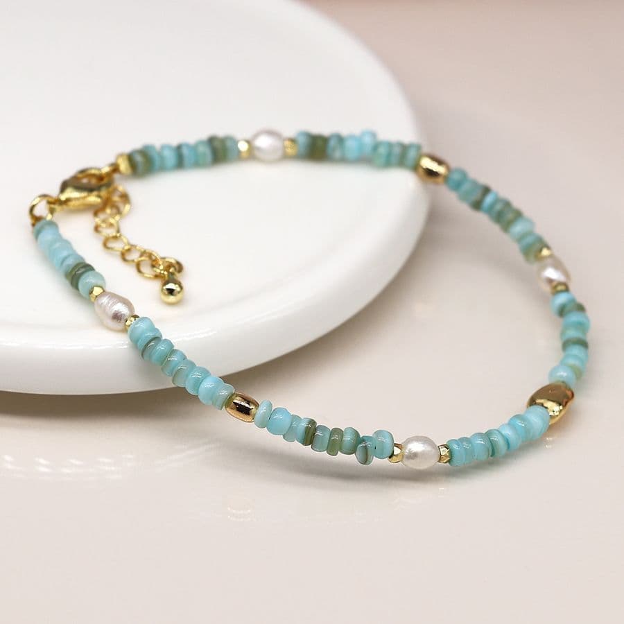 Mixed aqua blue, pearl and faux gold bead bracelet