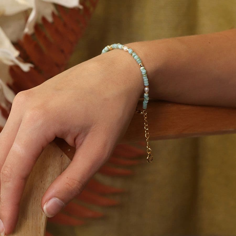 Faux gold plated bracelet with small beads in shades of aqua blue, little ivory pearls and golden beads, fastened with a faux gold lobster clasp and extension chain
