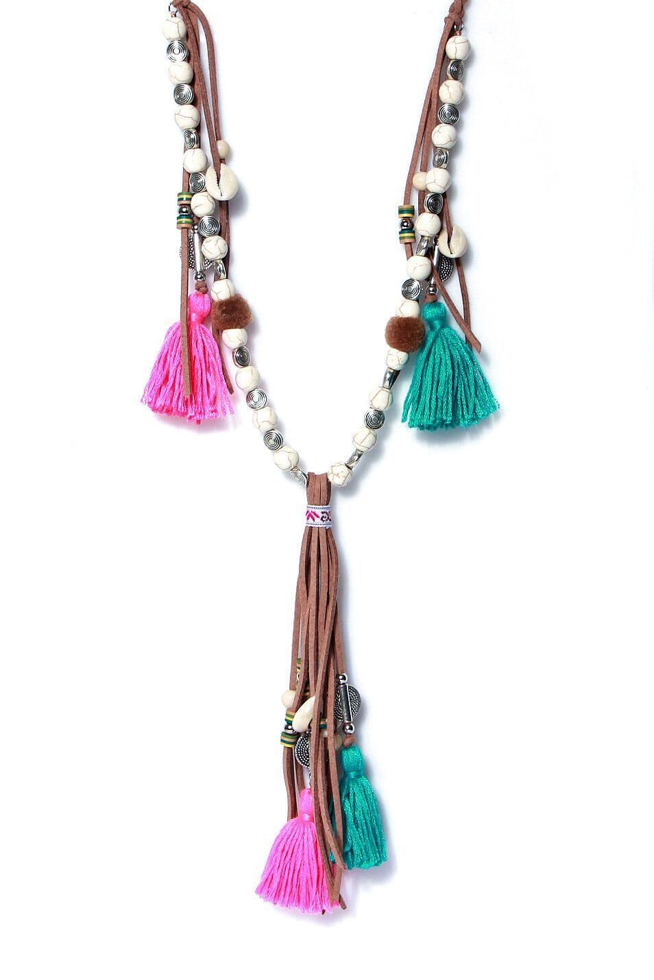 This fun statement boho necklace is off white leather with white beads, white and yellow tassel's, shells, pom pom's and charms decorating it.